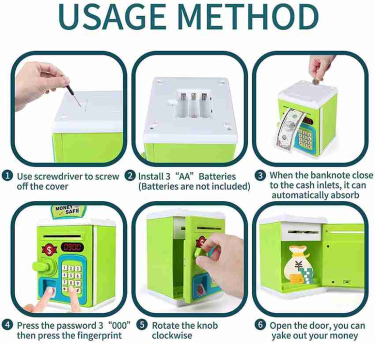 ⭐بسته شامل: 1 عدد قلک ATM (اندازه 5.1x5.3x7.3 اینچ)، 1 عدد دفترچه راهنمای کاربر؛ 10 وانمود کردن پول بازی، 6 سکه پلاستیکی، 3 باتری قلمی مورد نیاز (شامل نمی شود). می توانید از دستگاه خودپرداز برای ذخیره 600 سکه یا 100 پول کاغذی استفاده کنید. لطفا به حداکثر ظرفیت توجه کنید