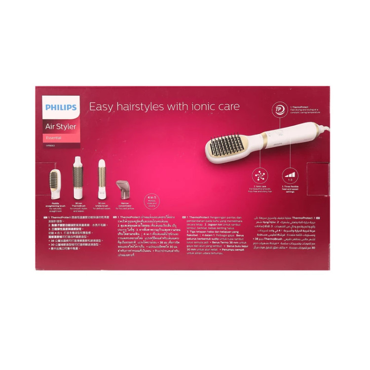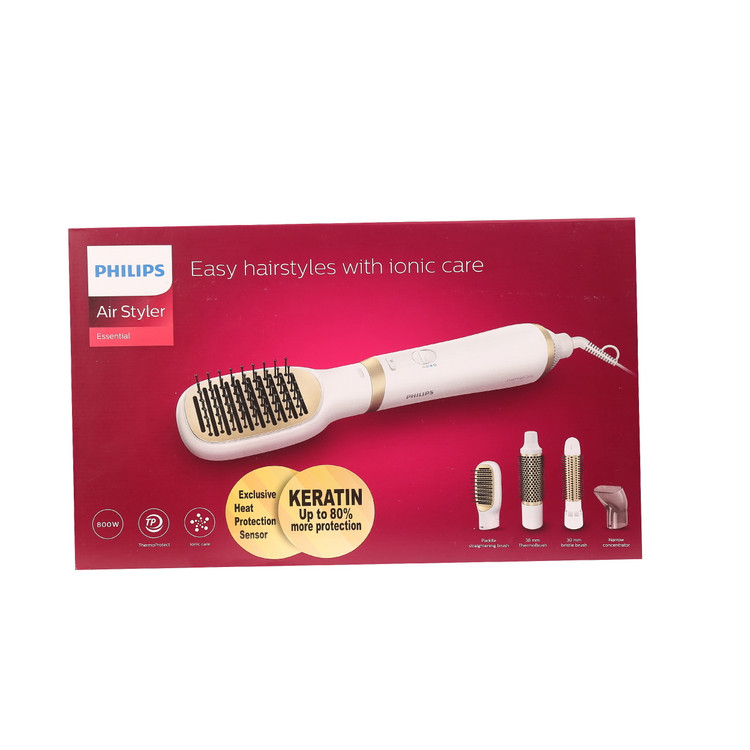 سشوار «فیلیپس» (Philips) مدل «Air Styler» نوعی سشوار برسدار با موتور 800 وات AC، چهار سری مختلف و قابلیت تولید یون است. سریهای سشوار شامل سه برس و یک متمرکزکننده هستند. برس پارویی برای خشککردن و صافکردن موها و برس گرد 38میلیمتری برای صافکردن و موجدارکردن موها استفاده میشوند. جالبترین سری این سشوار یک برس گرد دندانهدار است که با چرخاندن سر آن دندانهها به داخل میروند. برای حالتدارکردن موها باید یک دسته مو را به دور این برس پیچید و 7 تا 10 ثانیه صبر کرد تا به کمک گرما حالت بگیرد. با چرخاندن سر برس میتوان بهآسانی موها را از برس جدا کرد. برس دندانهدار برای حجمدادن به موها بسیار مناسب است. طبق انتظار، یک متمرکزکننده نیز همراه سشوار ارائه شده است که باد را با فشار به بیرون هدایت میکند و برای حالتدادن دقیق قسمتی از مو استفاده میشود. نوآورانهترین ویژگی این سشوار قابلیت تولید یون است که باعث میشود موها کمتر وز شوند و راحتتر حالت بگیرند و در نهایت درخشانتر و لطیفتر شوند. روی دستهی سشوار، دکمهای وجود دارد که به شکل کشویی حرکت میکند و برای روشن/خاموشکردن و تنظیم سرعت و دمای باد در سه حالت ترکیبی استفاده میشود. حالت TP هنگام خشککردن موها استفاده میشود و از موها دربرابر گرما محافظت میکند. خوشبختانه حالت باد سرد نیز وجود دارد که برای خشککردن موها در فصول گرم سال و همچنین تثبیت حالت مو استفاده میشود. سیم برق سشوار 1.8 متر طول دارد و دارای قابلیت چرخش 360 درجه و حلقهی آویختن است. بهطورخلاصه سشوار فیلیپس مدل Air Styler از یک موتور 800 وات AC ، سه برس و یک متمرکزکننده، قابلیت تولید یون، حالت محافظت گرمایی، حالت باد سرد و سیم 1.8متری چرخشی بهره میبرد و برای خشککردن، صافکردن، موجدار و حالتدارکردن موها انتخاب مناسبی است.