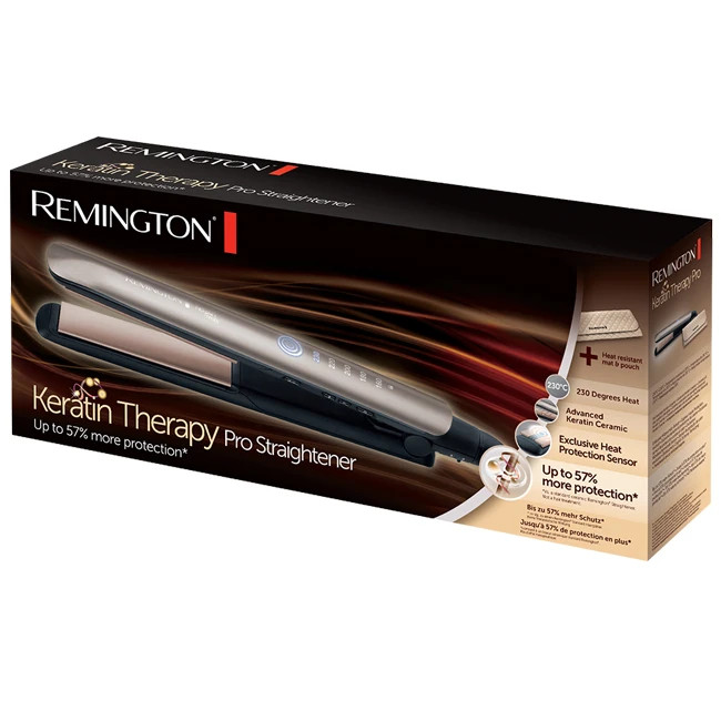 اتو موی S8590 رمینگتون از جمله نمونههایی در این کمپانی است که علاوه بر داشتن تکنولوژیهای روز دنیا دارای خاصیت درمانی نیز میباشد. در این محصول از بهترین نوع خصوصیات درمان یعنی کراتین درمانی استفاده شده است. کراتین درمانی چیست؟از دست رفتن کراتین داخل مو اصلیترین دلیل بروز خشکی، شکنندگی و آسیب دیدگی آن است، به دلیل داشتن همین خصوصیت موهای شما در برابر آسیب دیدگی و شکنندگی تا 57% محافظت شده و دیگر با مصرف اتوی مو احساس پشیمانی و یا نگرانی نخواهید کرد.S8590 دارای صفحات 110 میلی متری بوده که صفحه ای بلند در اتوها بشمار میرود. در تمامی اتو موهای رمینگتون گرم شدن سریع (15 ثانیه ای) صفحات از محسنات آنها به حساب میآید که در این مدل نیز این حسن دیده میشود، ضمن اینکه پس از 15 ثانیه بوق هشدار نیز برای اطلاع دادن به مصرف کننده در نظر گرفته شده است.بر روی بدنهی این دستگاه 5 دمای متفاوت از 160 تا 230 درجهی سانتی گراد دیده میشود که با تنظیم هر دما نور LED تعبیه شده در زیر آن روشن میشود.سنسور حرارتی اما سیستم جدیدی که تنها در این مدل قابل رویت است وجود سنسور حرارتی است. در این مدل علاوه بر اینکه کابر میتواند دمای اتو را به سلیقهی خود انتخاب کند با فشار دادن دکمه ای که در کنار دستگاه وجود دارد سنسور فعال شده و توسط قسمت باریکی که در صفحهی بالای اتو طراحی شده با توجه به جنس مو دمای مناسب را تنظیم میکند.در اکثر اتوهای جدید موجود در بازار امکان قفل دما با نگه داشتن دکمهی (-) که برای کم کردن دماست ممکن میشود که از تغییر احتمالی دما در حین استفاده جلوگیری میکند.سیستم ایمنی خاموش کردن خودکار نیز در این دستگاه وجود دارد که در صورت مورد استفاده قرار نگرفتن اتو پس از 60 ثانیه خاموش میشود.یک ضامن برای بستن بازوها نیز تعبیه شده که برای قرار دادن دستگاه در کیف بسیار جذاب آن کارایی خوبی دارد. این کیف مقاوم در برابر گرماست و گرمای اتو به آن آسیبی نمیرساند.در کنار تمامی خصوصیات قید شده وجود کیفی ضد حرارت و بسیار لوکس این اتو را به انتخابی ایده آل تبدیل کرده است.