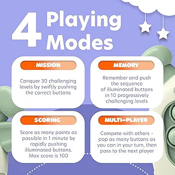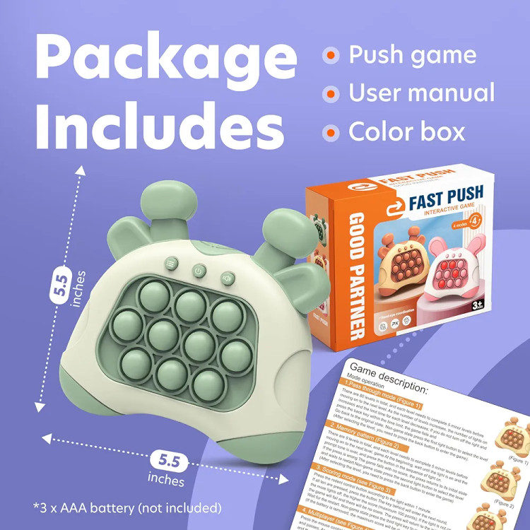استفاده آسان: تغییر حالت، صدا، و پاور – سه دکمه دارای بازی حباب فشار سریع ما، همچنین مجهز به راهنمای کاربر rush popper برای درگیری آسان و تجربه بازی بدون دردسر