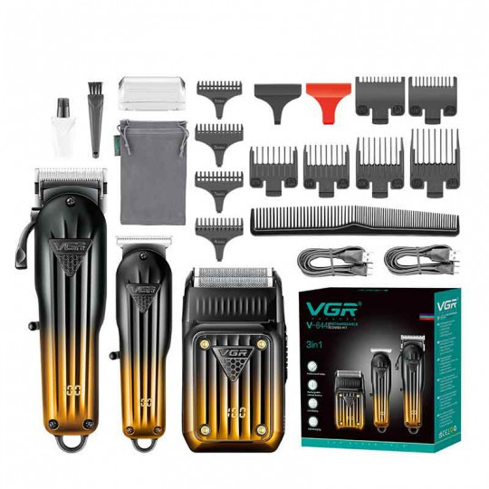 ست 3 قلو وی جی آر مدل VGR V-644 از جدیدترین و با کیفیت ترین محصولات برند وی جی آر VGR است. این محصول از 3 دستگاه حجم زن، خط زن و شیور تشکیل شده که هر کدام از بهترین های حال حاضر بازار هستند. در ساخت دستگاه ها از موتور بسیار قدرتمند بهره گیری شده تا به راحتی و در کمترین زمان اصلاح را انجام دهید و همچنین به منظور اطلاع از شارژ باقی مانده و زمان روغن کاری تیغهها صفحه نمایش LED روی بدنه تعبیه شده است.