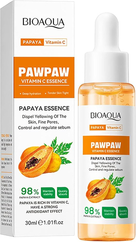 این تصویر مربوط به یک محصول مراقبت از پوست به نام **BIOAQUA Papaya Vitamin C Essence** است. این محصول یک سرم حاوی ویتامین C و عصاره پاپایا است که برای بهبود ظاهر پوست طراحی شده است. این سرم به منظور آبرسانی عمیق، روشنکردن پوست، کاهش زردی پوست، تنظیم چربی پوست و کوچککردن منافذ پوست فرموله شده است.