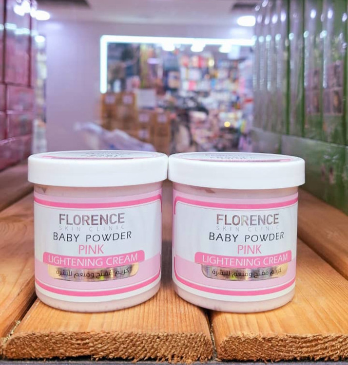 این تصویر مربوط به یک محصول با نام **"FLORENCE BABY POWDER PINK LIGHTENING CREAM"** است که احتمالاً یک **پودر بچه** یا **کرم روشنکننده پوست** با رایحه یا ترکیبات گلدار (با توجه به نام "Florence") و رنگ صورتی ("Pink") میباشد.
