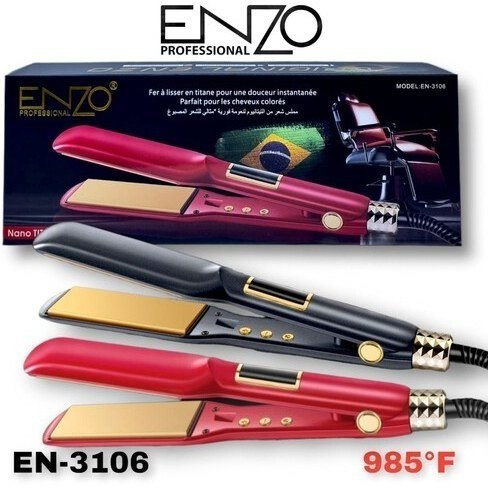 اتو موی انزو مدل EN-3106 دارای صفحات پهن برای استفاده حرفه ای در آرایشگاه یا برای اتو کردن موهای بلند در خانه می باشد. صفحات پهن دستگاه از جنس تیتانیوم است که با المنتهایی با توان 55 وات در کمتر از 30 ثانیه سطح صفحات یک دست داغ می شوند. اتو موی انزو ENZO PROFESSIONAL مدل EN-3106 دارای صفحه نمایشگر دما می باشد که دمای این مدل از 300 درجه فارنهایت تا 990 درجه بسته به نوع و جنس مو و مدل دلخواه قابل تنظیم است. صفحات این دستگاه برای انطباق با حجم مو شناور و رفلکس بوده تا مو را به بهترین شکل صاف کند و به موها درخشندگی بی نظیری ببخشد.